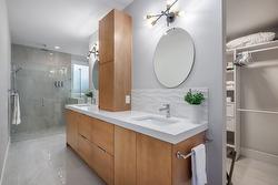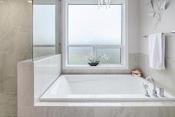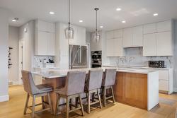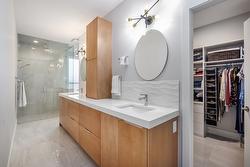 The walk out lower level is perfectly suited for extended family or short term rental use, offering two large bedrooms each with its own ensuite, including one that rivals the primary suite. A dining and prep area with a large island and seating creates a welcoming space. Step outside to the private backyard, where a juniper hedge provides privacy and a tranquil hot tub setting.