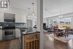 Welcome to Lakewind, ideally situated in the heart of West Kelowna. This immaculate 5th-floor residence is beautifully maintained and shows like new, offering stunning from your private covered patio. Designed for comfortable and flexible living, this oversized 1-bedroom plus den floor plan features a spacious primary suite with a walk-in closet and ensuite bathroom, along with a generous den that’s perfect for a home office, guest room, or additional storage. The bright open-concept layout is enhanced by 9-foot ceilings and quality finishes, creating an inviting and airy atmosphere. The kitchen seamlessly connects to the main living area and boasts stainless steel appliances, stone countertops, and abundant cabinetry. Step outside to enjoy your natural gas BBQ hookup while taking in the peaceful surroundings and lake views. Strata fees include heat and hot water, providing exceptional value and predictable monthly expenses. This well-managed, pet-friendly building allows two small dogs (with height restrictions) and is Telus Fibre Optic ready. Additional features include secure underground parking, storage, and beautifully landscaped grounds. Just steps from walking trails, parks, Gellatly Bay, shopping, restaurants, wineries, and transit, this home offers the ideal blend of tranquility and convenience. An excellent opportunity for first-time buyers, downsizers, or investors seeking freehold ownership in a prime West Kelowna location. (id:27)