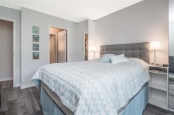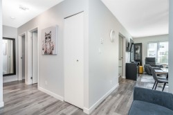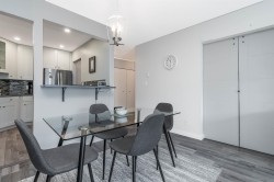 Summerhill. MOVE-IN READY! Furnished & beautifully updated 2 bed, 2 bath home in the heart of White Rock. Immaculate and well designed condo offers a modern kitchen with quartz countertops, white cabinetry, stainless steel appliances (new fridge) & double sinks. Designer colour scheme, stylish laminate flooring throughout with a bright spacious living room offering unique sliding barn doors leading into the 2nd bedroom. Primary bedroom has walk thru his/her closets & extra built in storages beside the bed. Enclosed sunroom (included in sq.ft.) with sliding glass doors & bonus storage! 1 parking stall & storage locker underground. Condo includes furniture. Centrally located within walking distance to White Rock town centre with its many shops & restaurants. 55+ age restriction & 1 cat ok.