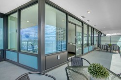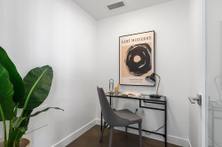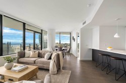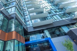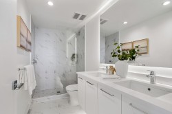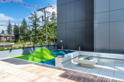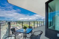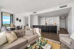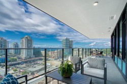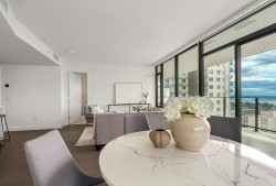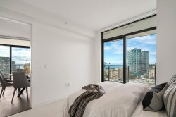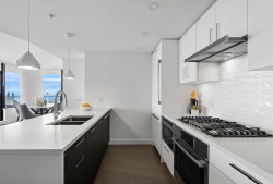 Brand new home exudes elegance and sophistication in the bustling heart of White Rock. This south- west corner 975 sf, 2 bdrm + den, 2 bath residence, with expansive 433 sf wrap-around balcony, boasts breathtaking 11th floor panoramic ocean and Gulf Island views. It showcases bright, open layouts, over-height ceilings, elegant finishes, air-conditioning and custom roller blinds. The modern kitchen features sleek, soft-close cabinetry, panelled Bosch stainless steel appliance package and a polished quartz, waterfall edge island, complemented by a contemporary color scheme and warm under-cabinet lighting. King-sized master bedroom has ensuite with quartz countertops, dual sinks and Grohe plumbing fixtures. Includes gas hook-up for BBQ, an EV-ready parking stall and storage locker.