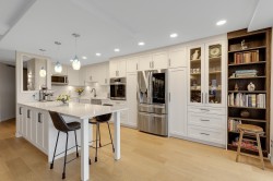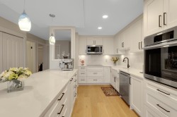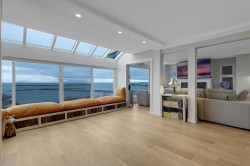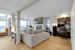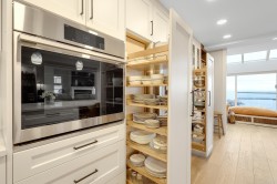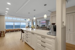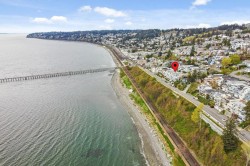 Great Ocean View! Rarely available extra-large 2-bedroom, 2-bathroom end unit offering breathtaking Ocean and White Rock Pier Views. This home has been fully renovated, featuring newer hardwood flooring, an updated kitchen with a massive 3' x 10' island, wall over and pull-out pantries, renovated bathrooms, LG premium Thin Q Studio Line appliances, custom millwork throughout, and extensive upgrades. Radiant floor heating and gas fireplace are included in strata fee. The well-maintained building has undergone major improvements, including rain screening, newer roofing, Hardie Plank siding, vinyl windows, and a large retaining wall. Step outside to pubs, restaurants, the beach, and the iconic White Rock Pier, or enjoying a jog along the waterfront - all just steps from your door.