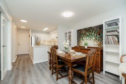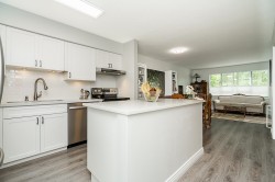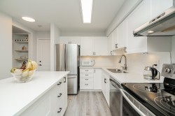 Renovated 2 bed unit in the coveted ARCADIAN! (PET FRIENDLY! 2 cats or dogs, no size limit!) Enjoy open-concept living with a modern vibe, fresh paint, new window screens and Hunter Douglas blinds. The kitchen boasts a sleek new island and stainless steel appliances. A redesigned laundry area offers custom storage and a handy hanging bar. Covered/Private Solarium. All lighting upgraded to energy-saving LED fixtures. This proactive strata includes a guest suite, library, workshop, and a renovated lounge/common room. One storage locker and one secure parking spot (extra parking for rent based on availability) plus lots of street parking. Prime location close to shopping, beach, hospital, transit and senior centre. Mobility benefit: walk to the unit with no need for stairs. Motivated seller