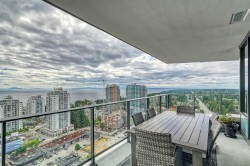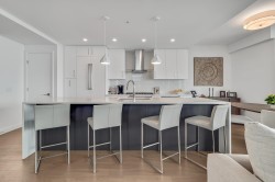 Exquisite Southwest - facing residence with panoramic ocean & mountain vistas. The Gourmet kitchen features quartz surfaces & premium Bosch appliances. 1428 Sq ft of sophisticated living with 2 generously sized bedrooms, each with ensuites, plus elegant powder room. Indoor-outdoor fireplace enhances seamless entertaining from the 549 Sq ft wrap around deck with stunning views. Comfort is elevated with climate-controlled air throughout, 3 rare side-by-side parking stalls with EV charging and resort-style amenities complete this premier White Rock offering. Walk to beaches, pier, groceries, restaurants and cafes - only 40 minutes to Vancouver. Experience unparalleled coastal luxury at its finest.