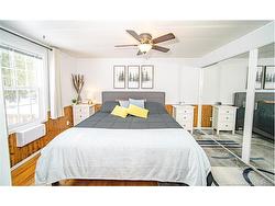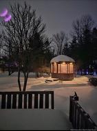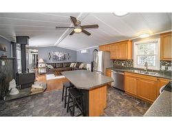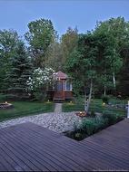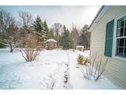 Pride of ownership shines throughout this mint-condition. Truly move-in ready and perfectly designed for one-level living. Step into spacious foyer with built-in storage and durable waterproof laminate flooring. Kitchen is the heart of the home, offering impressive amount of cabinetry, island, and full appliances included fridge, stove, dishwasher, and microwave rangehood. Just off the main living area, cozy living room features ductless heat pump for efficient heating/cooling plus wood stove for that “stay-in-and-relax” vibe. Separate dining room adds flexibility for gatherings and celebrations, patio doors leading to deck and private backyard setting framed by mature trees and landscaping. Layout offers excellent bedroom separation: primary suite tucked at one end with access to heated-floor half bath and adjoining dressing room/office (easily converted back to third bedroom). Second bedroom and main bath are located on opposite side, with main bath also featuring heated floors. Upgrades you’ll appreciate include tankless hot water heater, water softener, and electrical generator switch paired with Champion generator - plus HEPA air purifier to help keep indoor air fresh and clean. Enjoy beautifully landscaped yard with mature trees and gardens, pond, and enclosed gazebo. Insulated detached double garage, garden/workshop with electricity, and woodshed. Surrounded by trees for maximum privacy - and yes, wildlife visits are part of the charm.