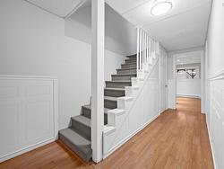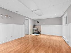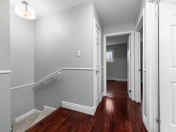 Welcome home to this beautiful 3-bedroom,1.5 bath property, ideally located on a family-friendly street close to excellent schools, transit, nature trails, and recreation, and backing onto a peaceful green belt. The main level offers a spacious living room with new laminate flooring, an energy-efficient heat pump, and abundant natural light, along with a modern kitchen featuring stainless steel appliances and a dining area that opens onto a generous deck and a lovely treed backyard. Upstairs includes three well-sized bedrooms, including a primary bedroom with a large closet and its own heat pump, plus an updated main bath. The finished basement provides a large rec room with a walkout and cozy pellet stove, a combined half bath and laundry room, and a huge storage space. The fenced backyard is perfect for outdoor play, and recent updates include a brand-new driveway 2025, new deck 2025, roof shingles (2013), vinyl windows (2014), laminate flooring on the main level (2021), and three heat pumps