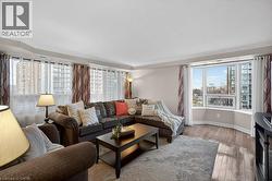 Experience refined condo living at The Maples, a highly regarded residence in the heart of downtown Burlington. This bright and inviting two-bedroom, two-bathroom corner suite offers approximately 1,430 square feet of thoughtfully designed living space. Morning light fills the bedrooms, while the kitchen captures the soft evening glow, creating a warm and welcoming atmosphere from sunrise to sunset. The spacious living and dining areas open to a private balcony, perfect for relaxing or entertaining. The kitchen offers modern finishes, ample cabinetry, and stainless steel appliances. Both bathrooms are well maintained, and the unit is beautifully cared for throughout. Additional conveniences include in-suite laundry, generous storage, an exclusive-use locker, and one underground parking space. The building offers a strong sense of community, with amenities such as a top-floor party room with a terrace and a guest suite for visitors. Steps from the lakefront, Spencer Smith Park, fine dining, and boutique shopping, this suite offers the perfect blend of comfort and convenience in downtown Burlington living. (id:27)