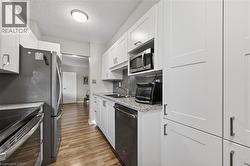 Welcome to this spotless south facing, one bedroom plus den unit. For your convenience, utilities are included in the monthly condo fee: hydro, heat, air conditioning, water, cable TV, and high speed internet. The outdoor pool, car wash bay, bike room, gym, hobby and party rooms are available for your use as well. The kitchen has been renovated, with stainless steel appliances and new flooring has been installed throughout the suite. No carpeting. Professionally installed new doors throughout, painted closet interiors and high end shelving has been added in the closets and laundry area. There is also a storage room in the unit, plus visitor parking for your guests and family. Enjoy your morning coffee on your private balcony as the sun comes up or walk down to Spence Smith Park. This perfectly located condo is just minutes away by car to the 403/QEW, 407, GO Train Station, Mapleview Mall, Burlington Centre, Ikea, Costco, groceries, library, senior centre, City Hall, and much more. Important note: the balconies and HVAC throughout the building were serviced/replaced in the last 6 years. (id:27)