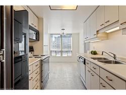 Downtown Burlington | The Residences of Village Square - Live at the Center of Everything.This inviting 2-bedroom, 2-bath condominium offers approximately 1,178 sq. ft. of thoughtfully designed living space, complete with two underground parking spaces and a private storage locker.Inside, discover spacious principal rooms and large, bright living areas and bedrooms enhanced by south-facing windows that fill the home with natural light. Village rooftop and partial lake views add charm and interest to your everyday setting. The primary suite features a generous walk-in closet and a jacuzzi ensuite, creating a relaxing private retreat. A full-size breakfast area and formal dining room provide flexibility for entertaining and everyday comfort.With timeless proportions and original finishes, this home is ready for reimagination—a perfect canvas to design and style a fresh, modern downtown retreat that reflects your personal vision.Set within a boutique building celebrated for its charm, intimate scale, and sense of community, residents enjoy access to a rooftop BBQ terrace and the ease of true walkable living. Step outside and stroll to Spencer Smith Park, the lakefront promenade, The Pier, coffee shops, restaurants, galleries, and everything that makes Downtown Burlington one of the city’s most desirable neighbourhoods.Pet restriction: Sorry, no dogs permitted. (Some rooms virtually staged/finished.)