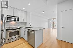 Experience the best of downtown Burlington living in this stylish one bedroom, one bathroom condo with a balcony. This suite combines comfort, convenience, and luxury with access to incredible amenities. From the moment you step inside, you’ll be impressed by the modern finishes, floor to ceiling windows and thoughtful design throughout. The chef-inspired kitchen is a highlight, featuring granite countertops, marble tile backsplash, sleek cabinetry, stainless steel appliances, and a breakfast bar with seating for three—perfect for casual dining or entertaining. Beautiful light hardwood flooring flows seamlessly through the open-concept living/dining area and into the spacious bedroom. The bedroom offers floor-to-ceiling windows and a walk-in closet. The elegant 4-piece bathroom is both relaxing and refined. The balcony extending from the living area provides an ideal vantage point to enjoy sweeping views of the escarpment and a touch of the lake beyond. In-suite laundry adds everyday convenience, while the building itself provides a long list of upscale luxurious amenities. Begin your morning with a swim in the indoor pool, unwind in the yoga studio or sauna, or find peace in the zen garden. Host gatherings at the outdoor BBQ area, challenge friends in the billiards room, or keep active in the fully equipped fitness centre. With 24/7 concierge service, your needs are always met. All of this is located just steps from Burlington’s vibrant downtown core, where you’ll find boutique shopping, diverse dining, and a lively waterfront community. Don’t miss your chance to call this stunning condo home and embrace the ultimate urban lifestyle. (id:7525)