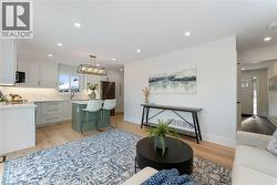 Wake up to quiet mornings & river air in this beautifully custom built new home, perfectly positioned on a large corner lot just steps from the Grand River. Whether it’s morning coffee by the water, evening walks along the trail, or quick trips into downtown Caledonia, this location offers the kind of lifestyle that’s hard to find - peaceful, walkable, and connected. The exterior showcases crisp white vinyl siding complemented by striking black soffits, fascia, eavestroughs, front door, and garage door. Soffit pot lighting adds evening curb appeal, while a rear deck off the sliding doors, fresh sod, and an asphalt driveway are to be completed. Inside, the home feels warm, bright, and thoughtfully designed for everyday living. The welcoming entry offers upgraded ceramic hexagon tile with convenient access to the laundry room and powder room. Light oak hardwood flooring runs throughout the main living spaces and bedrooms, creating a seamless flow. The heart of the home is the open concept kitchen, featuring white shaker style cabinetry with crown moulding & gold hardware, quartz countertops and backsplash, pantry storage, a pot filler over the stove, and stainless steel appliances - perfect for casual breakfasts or hosting friends. An extra wide staircase with iron balusters leads to the second level, where three comfortable bedrooms feature upgraded lighting and ceiling fans. The primary suite provides a peaceful retreat with a walk-in closet and a spa inspired ensuite, complete with a tiled tub surround, linen storage, and a stylish wood slat feature wall. A second full bath with a tiled tub surround and separate linen closet completes the upper level. A beautifully finished new home in a walkable, riverside setting - designed for comfort, style, and everyday life. (id:27)