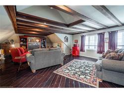 Here is your opportunity to own one of Caledonia’s notable homes. Enjoy this lovely home is surrounded by gardens & shady green space. Until recently, it was also the location of The Proper Topper Bridal shop -undergoing a metamorphosis to become a lovely family home which can be used for a home-based business. The owners have thoughtfully transformed this home while respecting it’s past. Boasting large principal rooms, light-filled rooms embrace a modern esthetic with neutral colours & lovely restored floors and/or engineered wood floors ("carpet-free" home!). Main level boasts a chef style kitchen, updated bath & incredible living room anchored with a whitewashed brick fireplace & refinished hardwood. Main floor laundry with newer washer/dryer. (Laundry hook-ups also on second level.) Restored bonus room for office or playroom. 2nd floor can be accessed by one of two staircases & has 3 generous sized bedrooms & a loft plus renovated bath with clawfoot tub & fully tiled shower. The showstopper is a double sized master bedroom oasis with windows overseeing backyard with mature shade trees. A 3rd level is a unique family room or private office with beamed ceilings, skylight, wooden floors & windows affording a view towards the Grand River. Many improvements: upgrades to all bathrooms, most newer windows, dramatic entrance door with sidelights, new wide baseboards, subway tile backsplashes, new & restored flooring, new light fixtures & pot-lighting. Building upgrades: metal roof (2006), newer appliances, new sump pump & drainage system in basement, all owned furnace, water heater & AC (2021). Some windows (2010,2015);Siding, eaves, soffits (2010). You will appreciate that there are no "popcorn" ceilings here! Offering a place of calm in a busy world. Kick back on your cedar deck, walk to local grocery & restaurants. Stroll along the river walk or visit Jones Bakery. This home has it all!