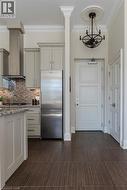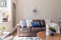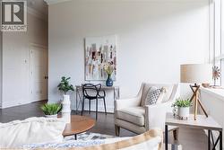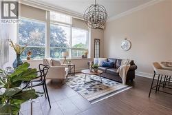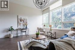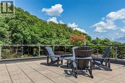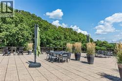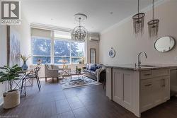 Situated on the West end of Dundas and nestled at the base of the Peak awaits the lifestyle, serenity, & sophistication you've been craving. Seamlessly blending the historical elements of the building with a contemporary & upscale aesthetic, the District Lofts offer a blend of character, charm, & modern convenience. Located in the original part of the building, Unit 207 boasts soaring 12’ ceilings complete with gorgeous crown moulding & upgraded lighting. The south exposure offers exquisite views onto the front gardens & Fisher’s Mill Park, allowing an abundance of natural light through the expansive windows. The open-concept kitchen/living area is at the heart of the unit. The modern fixtures & neutral decor create the perfect canvas to blend your own personal style. With ample cabinetry, granite countertops, stainless steel appliances, contemporary backsplash, & ornate pendant light fixtures, this kitchen is a stunner! The generously sized bedroom with stunning chandelier, a comfortable 4PC bath with soaker tub, & in-suite laundry complete this space. Radiant in-floor heating & two wall-mounted ac units add to the consideration and comfort put into this unit. Also on this level you’ll find the well appointed gym. The upper level offers the rooftop patio, accessible all year long. All this conveniently located just a short drive from West Hamilton & McMaster University. Embrace the ease of condo living in this spectacular one-of-a-kind property. Room sizes/sq ft approx. (id:27)