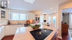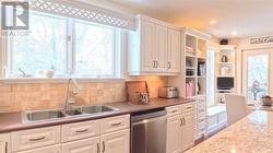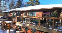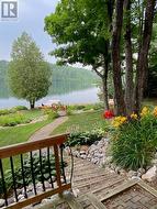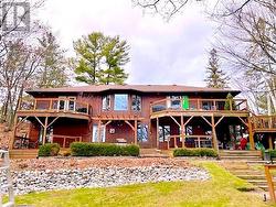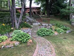 Welcome to 357 Clear Lake Drive, Espanola. Set on the shores of Clear Lake, this custom-built waterfront bungalow offers 3 bedrooms and 2.5 bathrooms in a private, extremely well landscaped setting with mature tree cover and terraced garden areas. The appeal starts with a curved driveway bordered by a stone retaining walls leading to an interlocking stone courtyard and stone steps to large front entry. The main level includes a bright eat-in kitchen with huge quartz island and quality appliances (refrigerator, stove, wall oven, induction cooktop, microwave, built-in dishwasher), a dining area and a large living room with lake views and built in propane fireplace. The primary bedroom overlooks the water and features built-in closets, private deck access and a renovated en suite with soaker tub, walk-in shower and in-floor heating. Main floor laundry with full-size LG stainless steel washer and dryer and a powder room add to overall convenience. The fully finished lower level offers a family room with lake-facing windows and propane fired stone fireplace, two additional bedrooms, 4-piece bath, office/den, wet bar with bar fridge, workshop, storage, and walk-out access to a full-width deck. Outdoor features include multiple decks, interlocking pathways, terraced lawns, and stairs leading to the water. A floating dock provides direct lake access for swimming and boating. Constructed with 2x6 framing and 2x12 floor joists, the home also includes attached double garage. Meticulously maintained waterfront home offering functional space, south facing lake front, and year-round enjoyment. A truly special offering at a great price! (id:27)