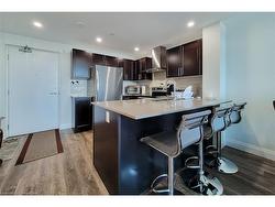 Welcome to modern, upscale living at Scenic Trails Condos, nestled in Hamilton's highly sought-after Mountview neighbourhood. This beautifully upgraded one-bedroom, one-bathroom condo offers the perfect blend of style, comfort, and convenience. Ideal for first-time buyers, downsizers, or investors, this main floor unit features a bright, open-concept layout with 9' ceilings, floor-to-ceiling south-facing windows, and custom blinds that fill the space with natural light. The kitchen is complete with stainless steel appliances, quartz countertops, perfect for cooking and entertaining. The spacious bedroom includes a walk-in closet, while the main bathroom and in-suite laundry add everyday ease. Step outside to your private open terrace with ideal for morning coffee or evening relaxation. Enjoy top-tier building amenities including a state-of-the-are gym, party room, billiards lounge with wet bar, games room, theatre room, and a beautifully landscaped courtyard with BBQs, fountain, fireplace, and lounge seating. This unit comes with an owned underground parking spot and locker. Located in a prime location close to absolutely everything!