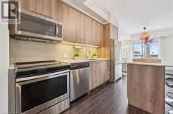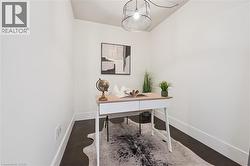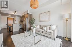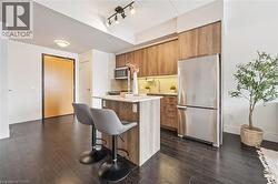 An ideal first home in a location that has it all. This meticulously maintained 1-bedroom plus den condo offers smart design, modern finishes, and easy, low-maintenance living in the highly sought-after Victoria Commons community, perfectly situated between Downtown Kitchener and Uptown Waterloo. The bright open-concept layout features carpet-free living, under-cabinet LED lighting, and in-suite laundry. The modern kitchen is both stylish and functional with quartz countertops, stainless steel appliances, ample cabinetry, and a centre island upgrade. The versatile den is ideal for a home office or guest space, while floor-to-ceiling windows and a north-facing exposure provide great natural light and comfortable temperatures year-round. The unit includes owned underground parking and a private locker. Enjoy excellent building amenities including a gym and party room, all within a quiet, well-maintained building. Move-in ready, well located, and easy to love; a smart first step into homeownership. Book your showing today. (id:27)