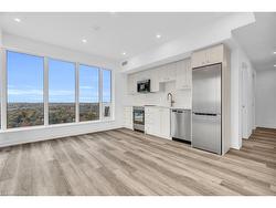 Discover an exclusive luxury corner condo unit in the prestigious Station Park Condos of Kitchener. This sophisticated 1-bedroom, 1-bathroom urban sanctuary combines contemporary aesthetics with everyday convenience. Enter a space where style seamlessly blends with comfort, featuring an open-concept living area bathed in natural light from floor-to-ceiling windows, offering panoramic city views. This condo boasts $17,000 in upgrades, including an upgraded kitchen, upgraded bathroom, window coverings in the bedroom, an entertainment package, and more. Storage unit and Underground Parking License included in purchase price! The gourmet kitchen is a culinary haven with state-of-the-art appliances, sleek countertops, and ample storage, making every meal a delightful experience. Retreat to the tranquil bedroom, complete with elegant touches, durable solid surface flooring, and plenty of closet space. The luxurious bathroom features high-end fixtures and a serene ambiance, perfect for unwinding after a busy day. Station Park offers unparalleled amenities, including a dedicated dog park, bowling alley, an amphitheatre, al fresco work stations, The Circuit—an innovative outdoor workout area—and expansive open spaces for relaxation, blending outdoor living with urban essentials. Seize the opportunity to elevate your urban lifestyle at Station Park Condos. Enjoy opulence and sophistication, strategically located near entertainment, fine dining, and efficient transit options. This 1-bedroom, 1-bathroom condo exemplifies contemporary refinement and modern luxury living. Vacant Possession Possible.