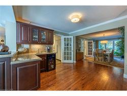 Nestled at the end of a highly sought-after court in prestigious Lorne Park, this elegant two-storey, five-bedroom residence blends timeless design with exceptional indoor and outdoor living. Ideally located within a five-minute walk of the highly rated Lorne Park High School and Lorne Park Elementary School, as well as a short walk to shopping and the local library. Upon entering, the spacious foyer leads to a dining room with a fireplace and a bright, modern kitchen featuring stainless steel appliances, an integrated refrigerator, a large island with breakfast bar, pantry, and a spacious dining area with garden doors opening to a large stone patio. Step down to the TV room, highlighted by a vaulted ceiling, cove lighting, and a two-sided gas fireplace shared with the kitchen dining area. A main-floor office with wrap-around windows and a private side entrance is complemented by an adjoining living room with a fireplace. Slate flooring extends through the foyer, kitchen, breakfast room, family room, and powder room, while hardwood floors enhance the remaining main level, adding warmth and sophistication. Upstairs, discover five generous bedrooms, including a primary suite with a luxurious five-piece ensuite and a large walk-in closet with a window, along with a four-piece main bath featuring a large glass shower. The finished basement, with cozy carpeting, provides abundant additional living space featuring a billiards room, family room, bonus room, three-piece bathroom, a large storage area, and a workshop. Enjoy outdoor living with a stone patio, lower entertaining terrace, sparkling pool and hot tub, pool house, garden shed, and a sprawling tree-lined backyard offering the utmost privacy. This is the perfect home and location for a young family—a rare opportunity on one of Lorne Park’s most coveted courts, combining sophistication, comfort, and everyday convenience. Make this beautiful Lorne Park home your family’s next chapter. Book your showing today.