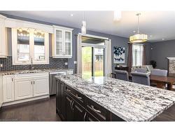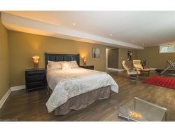 Welcome to this executive 4-bedroom, 4-bathroom detached 2-storey home, built in 2016 and located in the prestigious Fernwood Estates subdivision in Niagara Falls. Step inside to find rich, dark hardwood flooring throughout both the main and second floors, with no broadloom anywhere in the home. Nine-foot smooth ceilings and pot lights on the main level create a bright, upscale feel, while the impressive open-to-above foyer sets the tone for the rest of the home. The gourmet kitchen is a chef's dream, featuring granite countertops, a stylish backsplash, a breakfast bar, and stainless steel appliances. Porcelain tiles highlight the foyer and spacious laundry room, which also provides a walkout to the double-car garage. Upstairs, the large primary suite offers a luxurious 5-piece ensuite bath and a walk-in closet. Three additional well-sized bedrooms share a third 4-piece bathroom. The finished lower level, accessible via a separate walk-up through the garage, offers vinyl flooring, a large recreation/family room, a potential fifth bedroom, a full 3-piece bathroom, and a cold room for extra storage. The exterior is equally impressive, featuring a stone and stucco finish, an exposed aggregate driveway with parking for four vehicles, and a covered concrete patio ideal for outdoor entertaining. Built with style and functionality in mind, this 2016 home combines elegance, comfort, and premium finishes throughout.