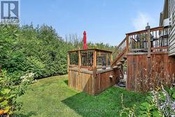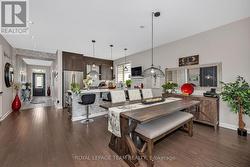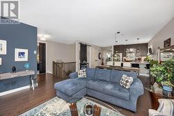This STUNNING Serenade Model Home built in 2018 is a True Bungalow boasting approx. 2,294 sq. ft. of luxurious living space as per the builders plan. This home has all the bells & whistles. FULL of Upgrades. Pride in ownership is evidenced throughout the home & grounds. The inviting front covered porch entices you in to your front foyer featuring ceramic flooring & a spacious clothes closet. The main floor den is big & bright w/a picture window & glass french doors. This room can easily be doubled as an additional bedroom. The open concept floor plan is sure to please featuring a chef's kitchen w/ upgraded cabinetry, granite countertops, a breakfast island that easily seats 4, pot lights, pendant lights & high end stainless steel appliances. There is a lovely undermount composite sink & matching faucet & even a mounted water pot filler! You will also enjoy a custom built in pantry & coffee bar. The formal dining area is open to the great room where you will find a cozy gas fireplace, picture windows, gleaming hardwood flooring & patio doors that lead to your backyard oasis where you will enjoy a two tiered deck & lower patio w/ gazebo. NO REAR NEIGHBORS. Only views of the forest beyond! The main floor primary suite includes a spacous bedroom, a large walk in closet featuring a custom closet organizer & a 5 piece executive ensuite bath. The two piece powder room & laundry room complete the main floor. The lower level staircase w/spindles brings you to your spacious family room w/ huge windows streaming in natural light, flat ceilings w/ pot lights & a ledge-stone feature wall with electric fireplace! There are two additional, generously sized bedrooms on this level as well as a full 3 piece bathroom. Located in a fabulous neighborhood in Kemptville on a quiet street, walking distance to shops, trails, activity centres, golf, Kemptville hospital & SO much more! Minutes to Hwy #416 & only 30 minutes to downtown Ottawa. (id:27)