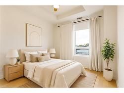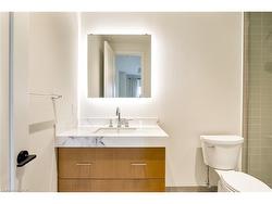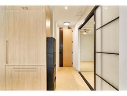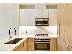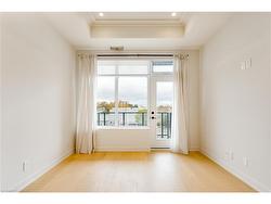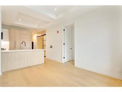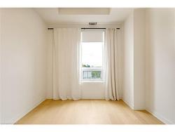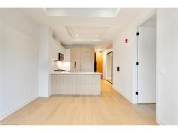 The prestigious boutique Berkshire Residences in Central Oakville are ideal for buyers seeking luxury, style, and a walkable lifestyle. Live steps from Fortino’s, Trafalgar Park, Kerr Village, shops and restaurants along Lakeshore Road West, Lake Ontario, Oakville Harbour, waterfront parks and historic downtown Oakville with its boutiques, fine dining and cultural events. Only 5 minutes to the QEW/403 and close to the Oakville GO Station — perfect for commuters. This bright, contemporary one-bedroom + den suite offers approx. 737 sq. ft. of refined living plus a private approx. 67 sq. ft. balcony. Highlights include soaring 10-foot ceilings, coffered ceilings in the kitchen, living room, dining room and primary bedroom, 9-foot interior doors, wide-plank engineered hardwood floors and abundant pot lighting. A wall of windows floods the living room with natural light and opens to the balcony — perfect for morning coffee or evening relaxation. The chef-style kitchen features sleek 2-tone cabinetry with under-cabinet lighting, quartz counters and backsplash, premium integrated and stainless steel appliances, and an island with a breakfast bar that transitions easily from casual meals to entertaining. Behind 4-panel frosted glass sliding doors is a versatile dining room or den. A stylish 2-piece bath and a laundry closet are located off the foyer. The serene primary suite offers a spa-inspired 3-piece ensuite with an upgraded oversized shower and frameless glass. Enjoy one underground parking space, and high-speed internet is included in the condo fee. Completed in 2024, this upscale building features a rooftop terrace with lake views, a gym, party room, catering kitchen, lounge, and 24/7 concierge — luxury living in Central Oakville.