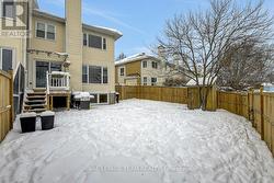 End-unit townhome set on an oversized pie-shaped lot in a quiet neighbourhood, backing onto public space with large parks & fantastic green space! Beautifully poised on a well-established street lined with mature trees, this well-maintained home exudes a welcoming and homey feel. Covered front porch and single attached garage with an expansive driveway. Sunken foyer with soaring ceilings sets an inviting tone and boasts practical built-in storage. Main living level opens into a bright, airy layout with generous room sizes, neutral grey tones, light hardwood-style laminate flooring & recessed lighting. Formal dining area anchors the front of the home, while the sun-filled living room at the rear features huge corner windows overlooking the backyard. Renovated kitchen seamlessly connects both spaces and showcases glossy white flat-panel cabinetry extended to the ceiling, striking black hardware, gleaming granite countertops, peninsula island with overhang seating, stainless steel gas range and direct access to the walkout deck - ideal for BBQing! Spacious primary suite with double-door entry, laminate flooring, walk-in closet & ensuite bathroom. Two additional bedrooms share use of the second full bathroom. Fully finished basement expands the living space further with a cozy gas fireplace, large window bringing in natural light & ample storage options -perfect for a family room, home office or hobby space. Fully fenced backyard is impressively sized and enhanced by a storage shed, large stone patio just off the deck, and lovely mature tree in the corner that adds both shade & privacy. Located in the heart of Old Barrhaven, surrounded by excellent schools, recreation centres & parks just steps away. Endless options for shopping, dining & everyday necessities. Close proximity to Highway 416 and well-connected transit. Big-ticket updates include AC, Furnace, Hot water tank - all replaced in 2020, plus Kitchen Reno - 2021, Dryer - 2025. (id:7525)