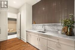 This exquisite custom-built residence by Cartesian Homes is a refined blend of modern architectural and timeless elevated design. From the moment you arrive, you're welcomed by a dramatic 16-foot foyer, setting the tone for the elegance and volume that defines the home. Just off the entry, a beautifully finished powder room and a spacious main-floor office offer a perfect balance of luxury and functionality for everyday living. The home unfolds into a grand open-concept living space, where 14-foot ceilings and striking clerestory windows create a breathtaking sense of light and scale. Designed for seamless flow, this central gathering space opens effortlessly to the outdoor living area, blurring the lines between indoor comfort and open-air relaxation. At the heart of it all lies the custom kitchen a masterfully crafted space showcasing rich millwork, graceful architectural curves, and polished detailing. Outfitted with panel-ready appliances that blend beautifully into the cabinetry. A fully outfitted prep kitchen and pantry perfect for entertaining providing function with complimentary aesthetics. The main floor features two generous bedrooms with private ensuites, including a primary suite that offers a tranquil retreat with a spa-inspired bath, shower, his and hers vanities, and walk-in closet. Downstairs, the fully finished lower level offers versatility with a second laundry room, home gym, two additional bedrooms, two full bathrooms (a third ensuite), and a sprawling recreation room designed for a home theatre and games area. The home features a double car garage with access through a custom mudroom, thoughtfully appointed with built-in storage. The exterior combines bespoke materials with maintenance-free composite fluted cladding, brick and stone elements, and durable steel siding designed for minimal upkeep. With thoughtful flow, soaring spaces, and distinguished craftsmanship throughout, this turn key home is complete. You won't find another like it. (id:27)