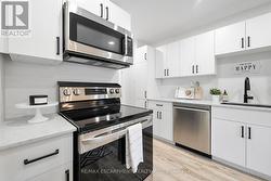 Stunningly renovated 3-bedroom, 1-bathroom two-storey condo townhome in St. Catharines desirable Carlton neighbourhood. Tucked away at the back of a quiet, family-friendly complex, this home offers added privacy, a fully fenced backyard, and a stylish, move-in ready interior. Features a bright, open-concept main floor with new vinyl plank flooring throughout, large principal rooms, and a custom kitchen with modern cabinetry, stainless steel appliances, quartz countertops, and a breakfast island. Sliding patio doors lead to a private yard with patio, green space, and a shedperfect for relaxing or entertaining. Upstairs includes 3 spacious bedrooms with contemporary finishes and a renovated 4-piece bathroom. The partially finished basement adds flexible space for a rec room, home office, playroom, additional bedroom or gym. Freshly painted throughout, move-in ready and located near parks, schools, shopping, and transitthis home offers the benefits of condo living without compromising on space or lifestyle. (id:27)