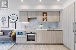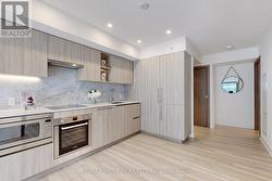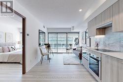 Luxury condo The Lakefront featuring a rarely offered south-facing 1+1 unit. The den with a glass sliding door can be used as a second bedroom, home office, or gaming room. Boasting 9' ceilings, wall-to-wall wood flooring, high-end integrated appliances, and floor-to-ceiling windows that fill the space with natural light. The bathroom and laundry area are efficiently combined for a spacious and practical layout. Thoughtfully designed layout with no wasted space. Enjoy over 23,000 sq. ft. of state-of-the-art amenities, including a Fitness Centre, Indoor Pool, Sauna, Theatre, Study Room with WiFi, Kids' Playroom, Pet Spa, Outdoor Lounge, 24-hour Concierge, Guest Suites, and more. The Lakefront is ideally located in the vibrant West Block, anchored by a 50,000 sq. ft. Loblaws flagship supermarket, 11,000 sq. ft. of restaurants, office space, and 87,000 sq. ft. of additional retail. Convenient access to public transit, parks, schools, the lakeshore, and all essential amenities. (The tenant is in the process of moving out. The showing will be available starting January 21) (id:27)