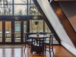 Country roads leading you home. Nestled and tucked away on a wooded 2.7 acres just south of Woodstock in Oxford Centre, this property offers the perfect blend of serenity and style. Along the tree lined winding landway, you'll find two small fish ponds and a spacious campfire area-an idyllic setting for peaceful mornings or evenings spent under the stars.The property features a unique and beautiful detached A-frame home, showcasing a soaring two-story stone fireplace, wraparound decks, and open-concept main floor living. The bright kitchen with the floor to ceiling windows flows nicely into the living area, perfect for entertaining. A separate formal dining room with gleaming hardwood floors also found throughout the main level. The main floor is complemented with an additional office space with direct exterior access making this the perfect spot for those who work from home. An updated bathroom completes the main floor with private views of nature in every direction. Upstairs, the impressive primary retreat includes a second fireplace, a six-piece ensuite, and a walk-in closet along with an additional bedroom . Both rooms feature unique custom architectural roof lines The lower level offers a spacious family room complete with a wet bar, wood burning fireplace, a 3rd bedroom, and a den-ideal for in-law potential-with a walk-up basement leading to the oversized double-car attached garage. Outside, you'll find a large 25' x 40' Quonset building with an RV hookup, a wraparound laneway with ample parking, tons of storage, and unmatched privacy. Don't miss your chance to experience this one-of-a-kind country retreat (id:27)