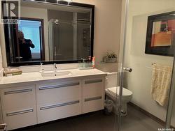 Wow! Here's your chance to own a Mint condition unit in Regina's Exclusive Riverbend district, in the fabulous Aura. Surrounded by water features, you'll love the long list of extras that this Condo offers. 9' Ceilings, Engineered Hardwoods, New York Style cabinets and Quartz Counters accent the Kitchen, with 2 Bedrooms with separate bathrooms off the spacious Living Room. The spacious Master offers plenty of Walk through Closet space and an Elegant Ensuite Bath! Look at the Amenities and compare! Luxurious Indoor pool and Hot Tub, Gym/Exercise Area, Amenities room and Lounge area. This unit includes 1 Surface parking stall. Don't miss out! Call Today! (id:27)