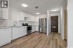 This condo is the perfect blend of homeownership and convenience, ideally located in Regina’s desirable south end within walking distance to numerous amenities, parks, and public transit, making everyday living effortless. Offering just under 1,000 sq ft of living space, the unit features two well-sized bedrooms and one full bathroom, along with an updated kitchen and bathroom that add both style and functionality. Recent improvements include a fresh coat of paint throughout and brand-new flooring completed this month, making the space completely move-in ready — simply bring your furniture and settle in. Thoughtful storage is found throughout, with generous closet space as soon as you walk in for coats and household items, additional storage built into the bathroom, and even more storage available in the basement. The unit also includes a dedicated parking stall, while the well-maintained building offers shared amenities such as a common recreation room, workshop space, and shared laundry facilities, making this an excellent option for first-time buyers, downsizers, or anyone looking to start their homeownership journey with minimal maintenance and maximum convenience. As per the Seller’s direction, all offers will be presented on 02/16/2026 4:00PM. (id:27)