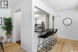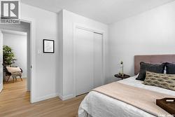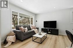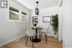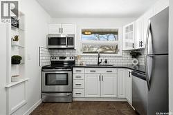 Welcome to this beautifully fully renovated bungalow located in the established and family-friendly Rosemont neighbourhood of Regina, ideally fronting onto green space and a park area for an open, private feel with no direct neighbours in front. Offering 960 sq. ft. on the main level, this move-in-ready home features a bright, functional layout with three well-sized bedrooms, a refreshed 4-piece bathroom, and durable vinyl plank flooring flowing throughout the main living areas and bedrooms. The updated kitchen is finished with tile flooring, modern cabinetry, stylish backsplash, and stainless steel appliances, and opens seamlessly to the dining and living spaces, making it perfect for everyday living and entertaining. The fully developed basement adds exceptional additional living space, including a spacious recreation room, an additional bedroom, and a 3-piece bathroom—ideal for guests, a home office, or growing families. Outside, enjoy a fully fenced yard with deck and patio areas, perfect for summer entertaining, along with a detached double garage providing convenient off-street parking and storage. With its extensive renovations, park-facing location, and close proximity to schools, parks, and amenities, this home is a fantastic opportunity in a mature, sought-after neighbourhood. (id:27)