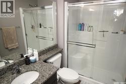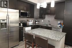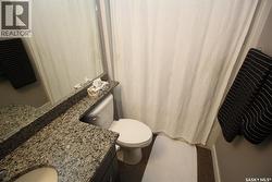 Located in one of Saskatoon’s most desirable communities. Top floor 2-bedroom 1055 sq ft condo with an unobstructed view to the west. Kitchen has granite countertops, rich espresso cabinets with soft-close drawers, dual undermount sink and stainless steel appliances. Large living room with a garden door that leads from the living room to the west-facing deck. The door has a convenient phantom screen and the deck has a gas barbeque hookup. Spacious primary bedroom with a 3-piece en-suite and a walk-through closet. Laminate flooring throughout most of the condo. The in-suite laundry room is large enough to accommodate additional storage. One underground parking stall and one electrified ground-level parking stall. This complex has a guest suite that may be rented, an amenities room and an exercise room. Additional storage is located in front of the underground parking stall. Several visitor parking stalls are located throughout the complex. Great location. Close to 8th Street shopping and restaurants and easy access to Circle Drive. (id:27)