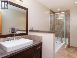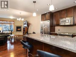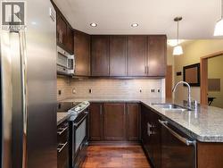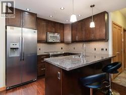 Enjoy tranquil river and greenspace views from this beautifully appointed, FULLY furnished 934 sq. ft. condo at Unit 103-32 Waterfront Place. This bright and upscale home features high ceilings, a spacious primary bedroom, a versatile den, and a well-designed layout that includes a laundry and utility area. The modern kitchen is finished with granite countertops accented with Labradorite, stainless steel appliances, hardwood cabinetry, under-cabinet lighting, and a convenient eating bar. The stylish bathroom offers quartz counters, a walk-in shower, and a separate soaker tub for added comfort. Step outside to a private 272 sq. ft. partly covered deck overlooking the river and greenspace, complete with a hot tub that's included with the unit. Additional highlights include a security system, one underground parking stall, and a storage locker. Located in the heart of downtown, this condo is just steps from shopping, restaurants, and the scenic waterfront trail system. (id:27)