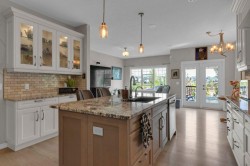 This stunning 4-bedroom bungalow built by McKee Homes showcases quality craftsmanship and thoughtful design, offering over 2,400 sq. ft. of beautifully finished living space backing onto the pond with serene views, walking paths, and easy access to schools and playgrounds. Perfect Family Or Retirement Home.The charming covered front porch welcomes you inside, where you’ll be greeted with 9’ ceilings, engineered hardwood floors, and an abundance of natural light. The open-concept main level features a chef-inspired kitchen with granite counters, stainless steel appliances including a gas stove & double oven, a large island, and a walk-in pantry—perfect for family gatherings. The main floor also hosts a spacious master retreat with a 5-piece ensuite (jet tub, oversized shower, dual sinks, walk-through closet), a second bedroom, and convenient main floor laundry.Downstairs, you’ll find a bright and inviting family room with a gas fireplace, a wet bar, two oversized bedrooms, a full bathroom, and extra comfort with electric baseboard heating. Plenty of storage is available throughout.Step outside and enjoy the fully landscaped, fenced backyard with a deck, patio, two sheds, and lush perennial gardens that bloom beautifully through the seasons—an outdoor oasis overlooking the pond. Additional highlights include R50 attic insulation, triple-pane windows, HRV system, and 50-gallon HWT.Built by McKee Homes, known for their exceptional quality and attention to detail.Don’t miss the opportunity to make this beautiful home yours—schedule your private showing today!