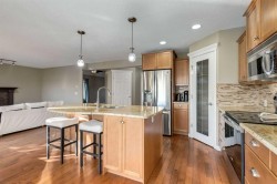 Welcome to this incredibly well-maintained family friendly home offering comfort and functionality. Perfectly positioned on a quiet street and backing directly onto a walking path, this property provides both privacy and easy access to the community’s natural surroundings. The backyard is a true highlight — showcasing mature trees, lush green grass, and an expansive deck ideal for morning coffee, weekend barbecues, and gathering with family and friends. Inside, you are met with fresh paint throughout the home while the front living room provides large vaulted ceilings and a welcoming atmosphere for relaxation and connection, with enough versatility to include a formal dining area if desired. A separate family room on the main level offers another warm gathering space, complete with a stunning tile-surround fireplace and mantle that sets the tone for cozy evenings at home. The heart of the home is the inviting kitchen, thoughtfully designed with new granite countertops, a central island with breakfast bar seating, a corner pantry, and stainless steel appliances. The open-concept layout flows seamlessly into the bright eating nook, framed by windows that overlook the peaceful backyard and allow direct access to the deck for effortless entertaining. Convenience is at the forefront of the main level design, including a dedicated laundry room equipped with ample cabinetry, a sink, and hanging racks—helping keep everyday tasks organized and efficient. The main level is complete with a 2pc powder room and functional mudroom space. Upstairs, the primary retreat delivers a serene escape with a walk-in closet and a 4-piece ensuite featuring a private water closet, standalone shower, and a soothing soaking tub. Two additional well-sized bedrooms and a full 4-piece bathroom complete the upper level, offering comfort for all family members. The fully finished basement offers brand new flooring and expands the living space even further. Here you’ll find a large family room anchored by another beautiful fireplace with a tasteful tile surround, perfect for movie nights or game days. An adjacent recreation area provides the flexibility for a home gym, playroom, or hobby space—whatever best suits your lifestyle. A spacious additional bedroom and a 3-piece bathroom make this level functional and private for guests or older children. Additional features include air conditioning! From the bright and thoughtfully designed interior to the tranquil outdoor setting, this home has been carefully maintained and offers exceptional space to live, relax, and grow. Don’t miss the opportunity to make it yours!
