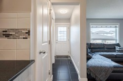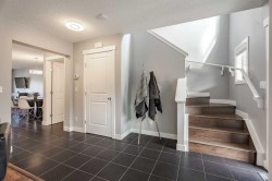 Welcome to this stunning and unique 1594 Sqft. duplex in Calgary’s sought-after Skyview Ranch. The open-concept main floor is highlighted by bold black tile flooring. The layout effortlessly connects the kitchen, dining, and living spaces, creating a welcoming environment that’s perfect for everyday living and entertaining alike. At the front of the home, a versatile den offers the perfect spot to work, relax, or host guests with ease. The kitchen impresses with sleek black granite countertops, stainless steel appliances, plenty of cabinetry, and a spacious pantry for all of your storage needs. Completing the main level is a 2-piece bathroom, a mudroom, and 2 additional storage closets. Upstairs, you’ll find three generously sized bedrooms. The Primary Bedroom features a serene ensuite bathroom with a soaker tub and standing shower, as well as a spacious walk-in closet. Completing the Upper level is a 4-piece bathroom, and large laundry room for convenience. The fully finished basement adds a fourth bedroom, and a large recreation room complete with a built-in bar—ideal for relaxing nights or entertaining friends. Step outside to your fully landscaped backyard, featuring low-maintenance artificial turf, a private patio, and a stylish deck. The front yard is also fully landscaped and features a covered front porch, elevating the curb appeal further. A double detached garage completes this exceptional home, offering plenty of parking and storage. Located in the vibrant Skyview Ranch community, this home balances modern style with comfortable living—ready for you to move in and make it yours.