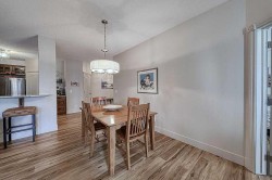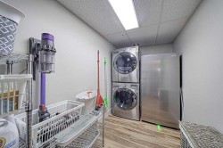 Step inside this completely renovated 2-bedroom, 2-bathroom end unit and experience a space where every detail has been thoughtfully designed for both comfort and style. The open floor plan begins with a welcoming entryway that flows into the dining area and living room, where an inviting electric fireplace creates the perfect spot to relax or entertain. Throughout the home you’ll notice the touches that set it apart—luxury vinyl plank floors, custom window coverings, upgraded light fixtures, neutral paint tones, and rounded corners that add a subtle touch of elegance.The kitchen is a true showpiece with rich walnut cabinetry, sturdy wood pull-outs in the lower cabinets, gleaming granite countertops, and a striking white arabesque tile backsplash. Stainless steel appliances, including a double oven installed in 2024, make this space as functional as it is beautiful. Both bathrooms have been fully upgraded to match, featuring walnut vanities with quartzite countertops, glass tile backsplashes, rectangular vessel sinks, and practical high-rise toilets.The primary bedroom offers plenty of space to unwind and includes a walk-in closet with a stunning custom organizer, complete with a floating walnut dresser topped with a solid plank. A spacious laundry room with a stackable washer and dryer adds convenience, while the north-facing patio provides a private retreat tucked behind a mature chokecherry tree. With central air included, this home is move-in ready and waiting for you to simply step inside and start living. As a resident of 151 Country Village Road NE you will enjoy an amenity-rich lifestyle. The complex offers a fully equipped fitness centre, indoor pool and hot tub, a recreation/party room, workshop and crafts room, bowling alley and theatre/movie room. There are guest suites available for hosting visitors, and underground titled heated parking stalls, many with extra storage. Elevators service the building and there is a car wash bay on site. Condo fees include a large number of utilities and access to these shared amenities. The building is well located with walking paths, ponds, green spaces, nearby shopping, and local dining options.