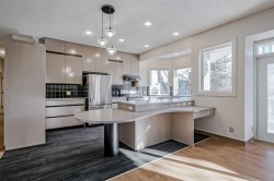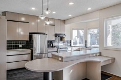 Welcome to 127 Canterbury Court SW, a beautifully maintained and first-time-on-the-market walkout bungalow tucked away in a quiet cul-de-sac in prestigious Canyon Estates — one of Canyon Meadows’ most sought-after pockets. Offering over 1,900 sq ft above grade and more than 3,400 sq ft of total living space, this home blends thoughtful updates, functional design, and timeless appeal.Step through the dual front doors into a bright, open foyer that flows into a sun-filled living room with large upgraded windows. The updated kitchen features stainless steel appliances, laminate countertops, ample cabinetry, and an extended peninsula for bar seating, perfect for casual dining or entertaining. A sink perfectly positioned under the window adds to the charm and functionality of this inviting space. The adjacent family room with a gas fireplace offers a cozy, welcoming area, while patio doors lead to the spacious back deck — complete with an awning for shade and stairs to the yard, ideal for enjoying warm summer evenings.Originally designed as a three-bedroom home, the main floor has been reconfigured into two spacious primary suites, each with walk-in closets and private ensuites.The main primary ensuite has been beautifully updated in a mid-century modern style, featuring dual sinks, a steam shower, and elegant finishes.The second primary suite includes a Safe Step walk-in jetted tub/shower combo, designed for accessibility and comfort — perfect for multi-generational living.The fully finished walkout basement offers exceptional versatility with a third bedroom, a full bathroom, a large family room with a wood-burning fireplace, and plenty of natural light from oversized windows. There’s also a spacious games room that can easily be converted into a fourth bedroom, plus a laundry room with abundant storage and a hobby/work area — ideal for crafts or projects.The double attached garage provides built-in shelving and overhead storage, while the heated 16' x 17' workshop in the backyard is a true standout — perfect for woodworking, car enthusiasts, or a creative studio, and features brand-new doors.Additional features include a clay tile roof, central vacuum system, updated bath tiles, and low-maintenance landscaping for easy care year-round.Located just minutes from Fish Creek Park, top-rated schools, shopping, amenities, and major routes, this home offers a perfect blend of convenience, comfort, and quiet suburban charm.This is a rare opportunity to own a customized walkout bungalow with a heated shop and dual primary suites in Canyon Estates — a home where space, function, and craftsmanship meet in perfect balance.