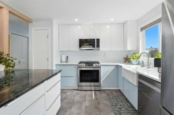 Welcome to 1454 Hunterbrook Road NW, a beautifully updated 4-bed, 2-bath bi-level home nestled on a quiet street in the heart of Huntington Hills. Situated on a gorgeous, well-maintained lot with a northwest-facing front yard, this property boasts a spacious layout, functional updates, and exceptional curb appeal. Step inside to find fresh hardwood, tile, and carpet flooring, paired with warm neutral tones and stylish finishes that make this home move-in ready. The main floor offers a bright, open-concept living and dining area, enhanced by large windows and a charming wood-burning stove that adds a cozy focal point. The updated kitchen features modern stone countertops, stainless steel appliances including an electric oven, a central island with breakfast bar, and plenty of cabinet space for the home chef. Three bedrooms and a fully renovated 4-piece bathroom complete the upper level, providing comfortable accommodations for families or guests. The fully finished basement extends your living space with a massive recreation/game room, an additional large bedroom, a full 4-piece bath, a dedicated storage room, and a spacious utility/laundry area. Outside, enjoy the fenced backyard with a private patio—ideal for summer BBQs and quiet evenings—and a double detached garage with ample room for parking and storage. This charming home is just steps from parks, playgrounds, schools, and shopping, offering both convenience and a strong sense of community. With easy access to Deerfoot Trail, Centre Street, and downtown Calgary, commuting is a breeze. Whether you're a growing family or looking for a versatile investment, this Huntington Hills gem combines classic charm with modern comfort in one of Calgary's most established neighbourhoods