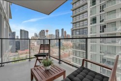 This stylish 1-bedroom, 1-bathroom residence sits high on the 17th floor, showcasing sweeping west-facing views of Calgary’s skyline.Inside, you’ll find a sleek open-concept design with bright finishes, quartz countertops, and custom cabinetry paired with light-toned vinyl plank flooring. The kitchen, equipped with premium Blomberg and AEG appliances. The living area is bathed in natural light and extends effortlessly to a spacious balcony, the perfect spot to unwind and take in the city lights.The bathroom combines function and relaxation with a deep soaker tub and clean quartz detailing. Residents of The Guardian enjoy access to a state-of-the-art fitness facility, stylish social lounge, workshop, bike storage, concierge, and 24-hour security. Positioned at the gateway to Calgary’s Culture + Entertainment District, this location is second to none. You’ll be steps from Stampede Park, the soon-to-be new arena, and the upcoming Green Line LRT. With all furniture negotiable, this home can be move-in ready from day one.