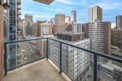 Welcome to the Executive SE Corner Unit in Prestigious Five West – Exceptional Value! Experience downtown living at its finest in this executive, air-conditioned 2-bedroom + den, 2-bathroom corner suite on the 19th floor of the sought-after Five West. This stunning SE-facing unit showcases breathtaking city views and abundant natural light all day long. The gourmet maple kitchen features granite countertops, a breakfast bar, and stainless steel appliances including a refrigerator (2020) and microwave & stove (2023) and opens to a spacious dining area and bright great room with a cozy corner fireplace. Enjoy engineered hardwood floors, floor-to-ceiling south and east-facing windows, and a versatile den off the main entrance, perfect for a home office. The primary bedroom offers a walk-in closet and a luxurious 4-piece ensuite, while the second bedroom is generously sized and features a cheater 3-piece ensuite, ideal for guests or a roommate. Additional highlights include fresh paint throughout, in-suite laundry, 7-day concierge service, a titled heated underground parking stall, and an assigned storage locker. Building amenities include an owner’s lounge, car wash bay, and indoor visitor parking.Ideally located steps to the LRT, river pathways, and downtown core, this home offers the perfect balance of convenience, comfort, and style. Pride of ownership throughout — an exceptional home for professionals or couples!