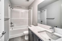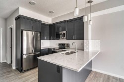 Step into this stylish 2-bedroom, 1-bath condo in the sought-after community of Harvest Hills, where a bright open-concept layout and thoughtful design maximize both comfort and function. The modern kitchen is a highlight, featuring stainless steel appliances, granite countertops, chic subway tile backsplash, and a kitchen island with breakfast bar - for both entertaining and casual dining. The spacious living area is filled with natural light and extends onto a large private balcony - perfect for relaxing or entertaining. The primary bedroom offers an inviting retreat with abundant windows, complemented by a versatile second bedroom that works equally well as a home office, guest room, or family space. Complete with in-suite laundry, a titled outdoor parking stall, and unbeatable proximity to transit, shopping, dining, and every convenience, this home delivers incredible value in a prime location.