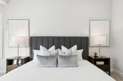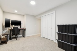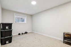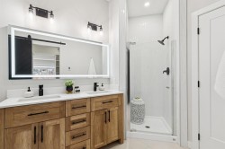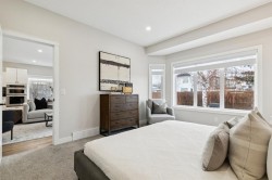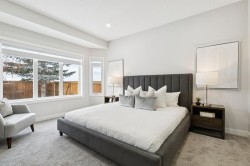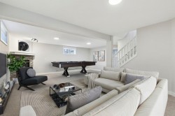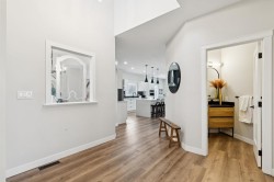 Discover unparalleled elegance in this exquisitely renovated bungalow, perfectly situated at the end of a cul-de-sac within the sought-after community of Lake Chaparral. From the moment you step inside, you are welcomed into a world of refined design and expansive living. Offering over 3,000 SqFt of meticulously developed space, this residence impresses instantly with soaring ceilings and beautiful wide-plank LVP flooring that flows throughout the open-concept main floor. The kitchen is a true showpiece, featuring an abundance of cabinetry, a corner pantry, and a striking quartz waterfall island that offers generous seating. A suite of premium stainless steel appliances, including a built-in oven and a versatile convection oven/microwave, is complemented by stylish black subway tile and designer lighting, creating a sophisticated and functional space for both everyday living and entertaining. The main floor also hosts a large, bright formal dining room with charming bay windows overlooking the front porch, and a large private office/den that captures tranquil views of the adjacent green space. The owner's retreat overlooks the backyard, complete with a walk-through closet leading to a luxurious en-suite bathroom. This spa-like space features a large soaker tub with a custom tile surround, a dual vanity, a separate shower, and the added comfort of heated flooring and a heated/LED vanity mirror. The main level is thoughtfully completed with a half bathroom, a laundry room with garage access, and ample closet space. Descend to the fully finished basement to find a vast living and recreation area, centered around a cozy gas fireplace. This level also includes three large (sound proofed) bedrooms with generous closet space and a full bathroom, providing ample room for family and guests. The home’s infrastructure has been meticulously updated, including new attic insulation, a new electrical panel, AC, a HE furnace, and a newer water tank, along with a precautionary radon fan reduction system for ultimate peace of mind. Step outside into the professionally landscaped, west-facing backyard, completed in the summer of 2025. A private gate provides direct access to a large green space, offering an idyllic setting for a walk while soaking in breathtaking views of the Rocky Mountains. This exceptional property offers a lifestyle of convenience and leisure, with four seasons of activities at the lake and easy access to Stoney Trail and the premier amenities at The Gates of Walden. This is more than a home, it's an opportunity for a life of quiet luxury and natural beauty.