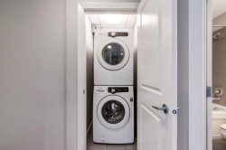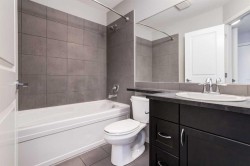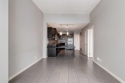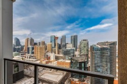 Spectacular Downtown Skyline Views from the 27th Floor! Welcome to this stylish 1-bedroom, 1-bathroom condo offering 589 sq. ft. of modern living space in the desirable Nuera building. Perched on the 27th floor, this home showcases breathtaking 180-degree downtown skyline views, including the Calgary Tower, through stunning floor-to-ceiling windows. The open-concept layout is bright and functional, seamlessly connecting the living and dining areas. The contemporary kitchen features mocha-stained maple cabinetry, mosaic tile backsplash, under-cabinet lighting, and built-in dining table that doubles as a workspace. Step onto your private balcony to enjoy the vibrant city views, or wake up to the skyline from the spacious primary bedroom. Additional highlights include in-suite laundry, a storage locker, and a titled heated underground parking stall. Nuera offers a fully equipped fitness centre and smart HVAC air circulation technology. Ideally located steps from downtown, the BMO Centre, LRT, and the shops and restaurants of 17th Avenue, this home delivers the ultimate inner-city lifestyle.