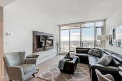 Spectacular South Views in this 1-Bedroom Layout . Luxury Living in The Guardian.Welcome to your sky-high sanctuary in The Guardian—Calgary’s tallest residential tower. This stunning one-bedroom condo boasts south unobstructed, panoramic views of the Rocky Mountains, Calgary skyline, and breathtaking sunsets through floor-to-ceiling west-facing windows.Offering the largest 1-bedroom floor plan in the building, this unit includes a built-in desk and bookshelf, kitchen island, and a spacious 110 sq ft balcony—perfect for working from home or entertaining guests.The modern kitchen features sleek cabinetry, integrated appliances, and undercabinet lighting, creating a clean, contemporary aesthetic. Wake up to sunrises over the Calgary Tower, and enjoy the comfort of central A/C during summer months.Enjoy five-star amenities including:j24-hour concierge service, Secure titled underground parking. Fully equipped fitness centre, Workshop, Party room, Assigned storage lockerWith a Walk Score of 94, you're steps from everything: Stampede LRT Station, Pixel Park, Sunterra Market, Music Mile & East Village Restaurants, cafés, and bike paths, The Elbow River and Stampede GroundsWhether you're a working professional, an investor, or seeking a vibrant urban lifestyle, this home checks every box. Come book your private showing today!