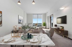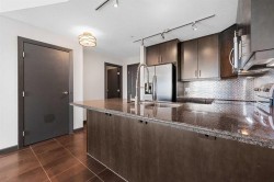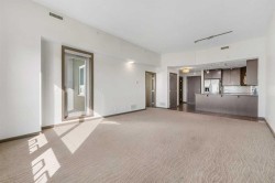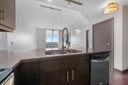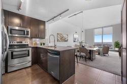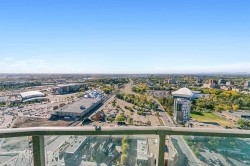 Perched high on the 32nd floor, this stunning south-facing unit offers breathtaking panoramic views of the Rocky Mountains and Stampede Grounds through floor-to-ceiling windows. With soaring 10 ft ceilings, the space feels bright, open, and luxurious. The kitchen boasts granite countertops, stainless steel appliances, and a stylish backsplash; a perfect place for creating delicious meals for yourself and guests. A massive living room makes the most of the incredible views with floor to ceiling south facing windows giving you a magnificent space to curl up with a good book and gaze at our wonderful city. The spacious bedroom features a walk-through closet leading into the bathroom; a great place to rest your soul after a day of fun and adventure. To further support your carefree lifestyle this home also includes air conditioning, titled underground parking and a storage locker for your convenience. The building offers resort-style amenities including concierge service, a large fitness center, hot tub, steam room, theater, and party room. This condo is the idyllic home for you with stunning views, luxurious space and amazing amenities all within your own building.