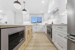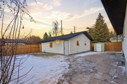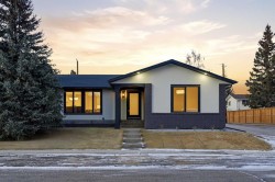 GORGEOUSLY RENOVATED INSIDE & OUT | UNIQUE LAYOUT WITH 2 PRIMARY BEDROOMS | 4 TOTAL BEDROOMS | 3.5 BATHROOMS | WALKING DISTANCE TO THE BOW | Thoughtfully re-imagined from top to bottom, this exceptionally large bungalow delivers modern comfort, flexible living and refined design in a sought-after setting. Nearly 1,500 sq ft on the main level allows everyday life to unfold with ease, while an open-concept layout creates natural flow for entertaining and quiet moments at home. Luxury vinyl plank flooring provides durability and warmth underfoot, paired with a calm neutral colour palette and curated designer lighting that elevates each space. Oversized windows with both south and north exposure fill the home with natural light throughout the day, creating a bright and balanced environment. Evenings are anchored by a striking fireplace that brings warmth and visual focus to the living area, while clear sight-lines across the dining space encourage connection during meals and gatherings. A chef-inspired kitchen blends style and performance with stone countertops, full-height cabinetry for generous storage, a gas range and a large centre island that doubles as a social hub with casual seating. Design-forward details continue into a beautifully finished powder room where bold wallpaper and elevated fixtures add personality without sacrificing cohesion. A rare dual primary suite configuration on the main floor offers outstanding flexibility for multi-generational living, long-term guests or home office needs. One primary retreat features a spacious layout, custom walk-in closet and a spa-inspired ensuite with dual sinks, a deep soaker tub and an oversized rain shower. Comparable comfort is found in the second bedroom, which includes its own walk-in closet and private ensuite. Additional living space extends into the fully finished basement, completed in the same refined style as the main level. A generous recreation area supports movie nights, games and casual entertaining, complemented by a built-in bar for easy hosting. Two additional bedrooms provide versatility for family, guests or workspaces, supported by a beautifully updated 4-piece bathroom. A well-appointed laundry room enhances daily function with upgraded backsplash, ample storage, sink, folding counter and front-load appliances. Outdoor living is equally considered with a large fully fenced backyard offering privacy and room to relax. Summer gatherings are supported by an expansive patio, while a grassy play area accommodates kids and pets. Everyday convenience is elevated by having an oversized double detached garage accessed from a paved back lane on a corner lot, providing secure parking and storage. This prime location places shopping, parks, green spaces and schools close at hand, with quick access to Market Mall, the University of Calgary and the Children’s Hospital. Thoughtful design, functional flexibility and long-term livability come together in a home that supports both active and relaxed lifestyles.