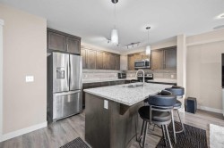 A Spectacular Townhouse with High-end finishes like granite countertops, stainless steel appliances, custom cabinetry and designer ambient lighting!!! Open floor plan with large windows flooding the space with tons of natural light and soaring high ceiling, the list is never ending. Huge beautiful kitchen, featuring a large island, pantry, quartz counters with trendy backsplash, stainless steel appliances with water line to the fridge and tons of cabinet space. A must see and feel kind of a home.You can enjoy your morning coffee in the sunny balcony overlooking the park/playground. The upper floor features a luxurious master bedroom with private ensuite and custom walk-in closet. There is also an additional bedroom, another 4 piece bath and upstairs laundry. The ground level has an oversized single garage with extra storage, as well as a utility room for even more storage. Conveniently, the visitor parking is located right across from the condo. Lots of extras in this home like a built in sound system, pot lights in master bedrooms, upgraded countertops and carpets and gas line to the deck.