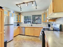 This is your chance to own a spacious home on an impressive 60-foot-wide R2 zoned lot, offering 7,200 square feet of future development potential in one of Canmore’s most desirable neighborhoods. The upper level welcomes you with a thoughtfully designed open floor plan featuring an upgraded kitchen, cozy living spaces, three generous bedrooms, two full bathrooms, and a built-in office space ideal for remote work or study. The lower level, accessible through a separate entrance, includes a private one-bedroom suite complete with a full kitchen, comfortable living area, and access to shared laundry. Storage is abundant throughout the home plus the convenience of a single attached garage plus off-street parking. Outside, the backyard is a true retreat. Step onto the huge private deck and take in the breathtaking mountain views that surround the peaceful yard, a rare setting that delivers privacy and beauty in equal measure.